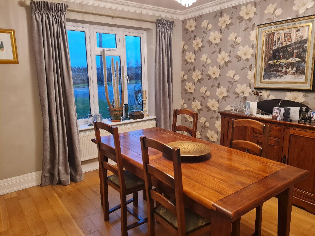 Dining room: Grey walls with a floral papered feature wall, silver curtains, engineered oak flooring, crystal light fitting, serving hatch from kitchen and double doors linking to the lounge.