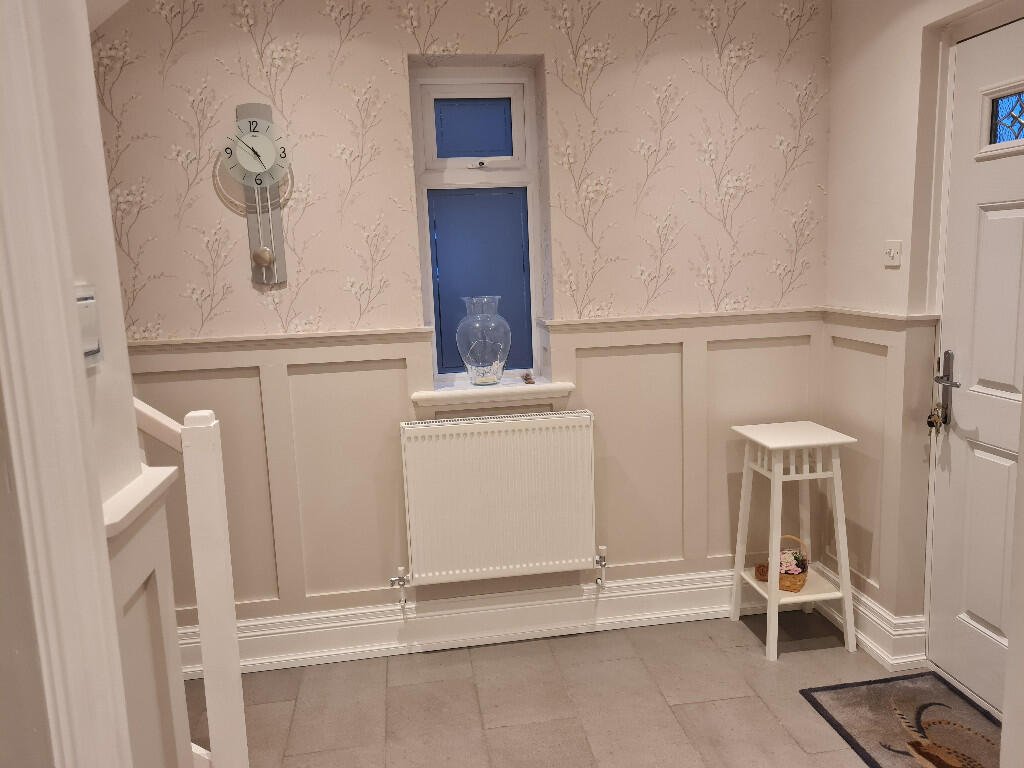 Entrance hall: A welcoming entrance with grey paneled walls with patterned wallpaper above, grey tiled flooring and under stair storage cupboard housing the fuse board and electric meter.