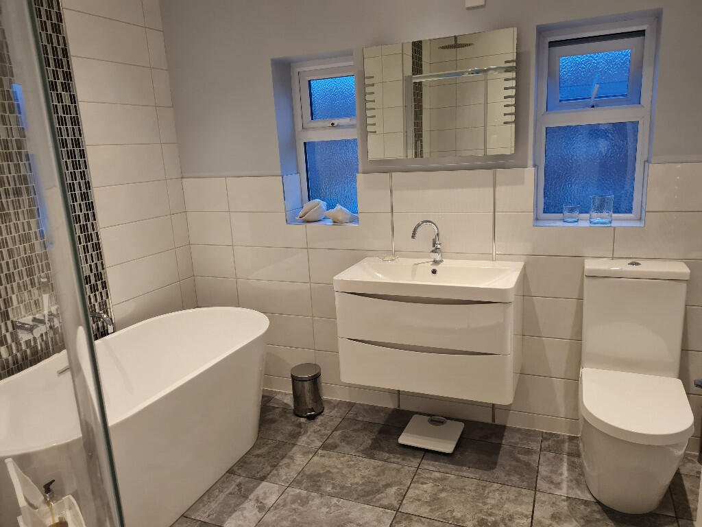 Bathroom: White freestanding bath with chrome taps and shower head. Shower cubicle with waterfall showerhead and additional shower attachment. White vanity mounted basin with chrome mixer tap and touch light vanity mirror. White toilet with push flush, chrome heated towel rain, extractor fan. White tiles with mosaic border/grey painted walls. Grey floor tiles.