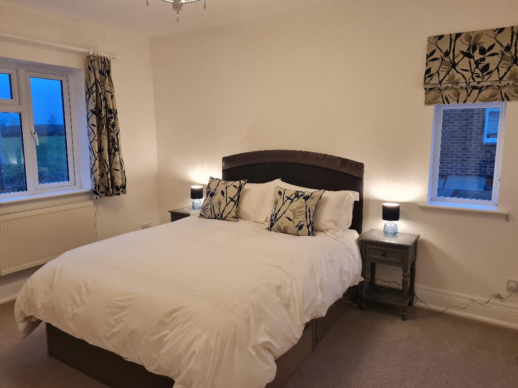 Bedroom 1: Double bedroom located at the front of the property with white walls and grey carpet. Leaf patterned curtains and roman blind. Open countryside views