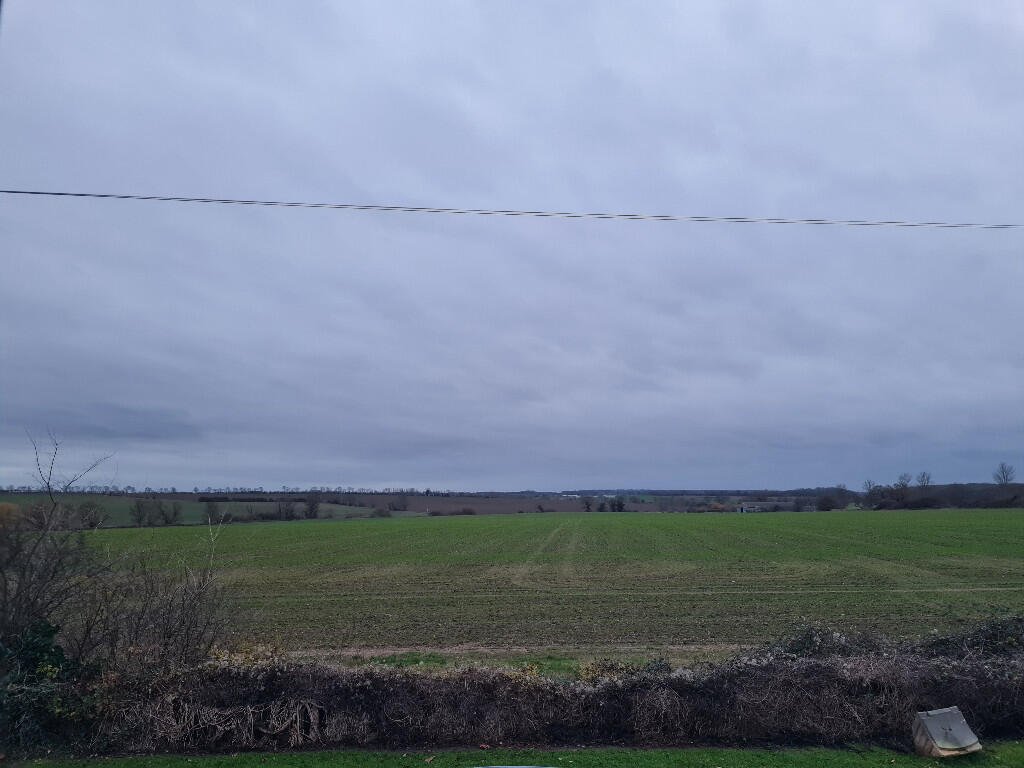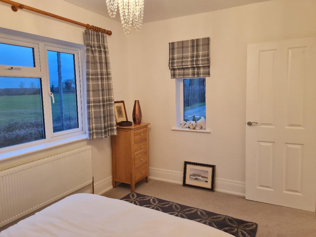 Bedroom 3: Double bedroom at the front of the property with white walls, grey carpet, crystal light fitting and grey check patterned curtains & blind. Open countryside views.