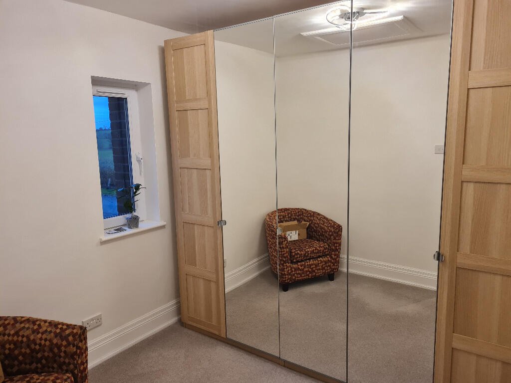 Bedroom 4/dressing room: Single bedroom with white walls and grey carpet. Large mirrored sliding door wardrobe with rails and shelving.