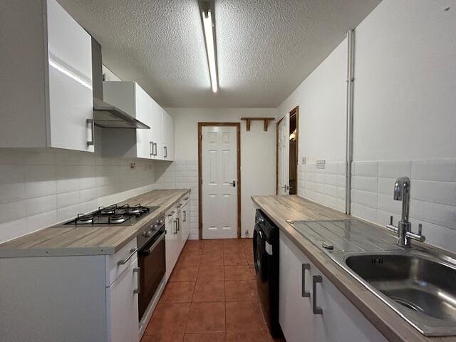 Kitchen: 7’1″ x 9’10” (2.16m x 3.00m), Fiited kitchen comprising a range of eye level and base units and drawers. Built in gas hob and electric oven. Stainless steel sink unit & single drainer. Work surface and tiled splashbacks. Spaces for washing machine and fridge freezer. Tiled flooring. Under stair pantry / cupboard. Rear garden access via UPVC door and window.