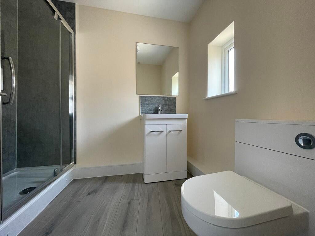BATHROOM 8′ 2″ x 6′ 6″ (2.49m x 1.98m) Window to side, low-level WC, double shower cubicle, heated towel rail, airing cupboard.Â