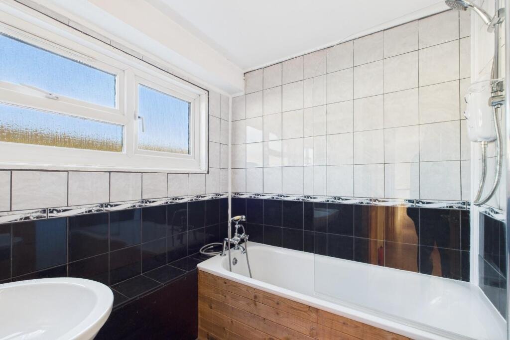 Bathroom – Fitted two piece suite comprising; wall mounted wash basin, panelled bath with mixer fed shower attachment and separate electric shower over, ceramic tiled floor, radiator, tiled walls, double glazed window to front.