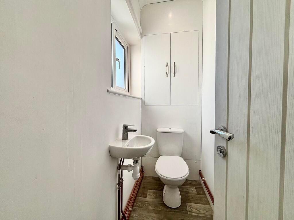 W.C. Suite comprising low level WC, pedestal hand basin, extractor fan, laminate flooring.Â