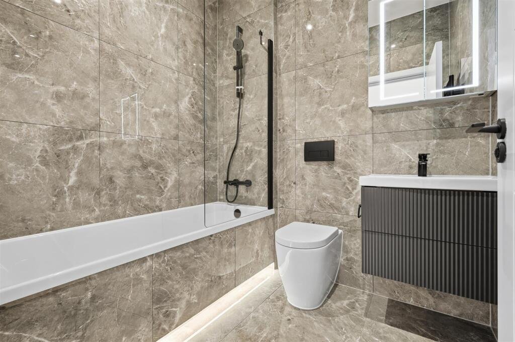 This apartment features an open plan living area with engineered wood flooring, a sleek kitchen equipped with Bosch appliances, two double bedroom complete with fitted wardrobes. The modern family bathroom, ensuite and an additional storage cupboard