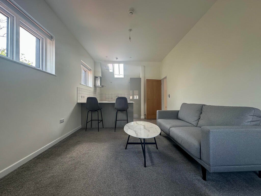 LOUNGE Large, bright, open plan room to kitchen with grey carpet. Two seater grey sofa, arm chair and coffee table.Â