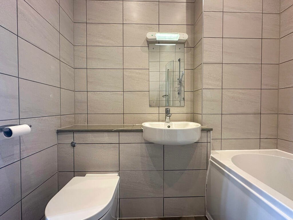 BATHROOM Modern suite, tiled with wash basin, WC, heated towel rail and shower over bath.Â