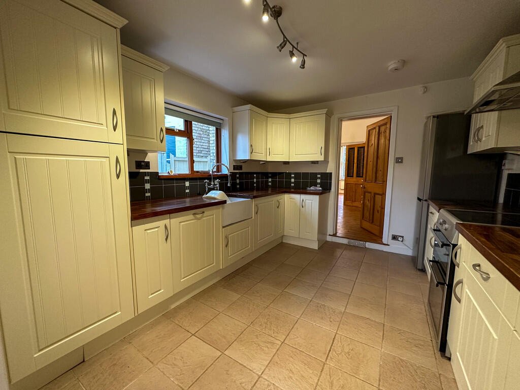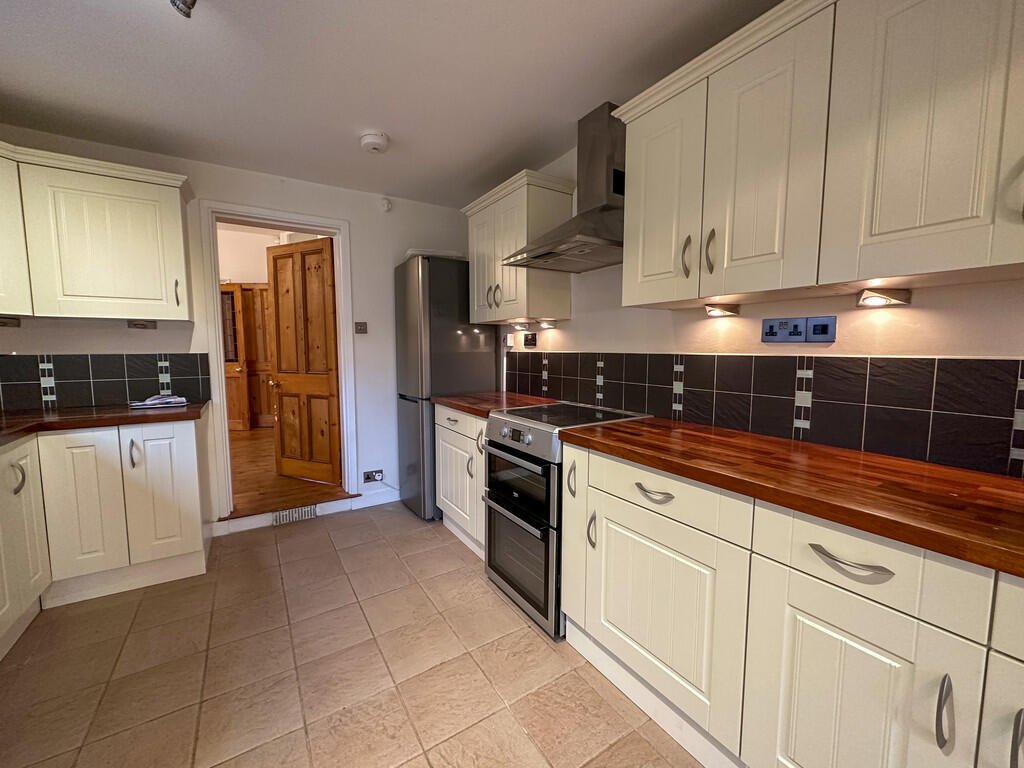 With tiled flooring, window with fitted blinds, patio doors with fitted blinds, radiator, a range of fitted cupboards and drawers, wooden worktops, Belfast sink with mixer tap, electric cooker, extractor hood, fridge freezer, fitted washing machine, and fitted dishwasher.