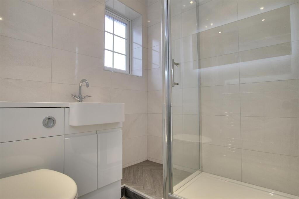 BATHROOMFitted with three piece suite comprising panelled bath with shower over, pedestal wash hand basin and low-level WC, ceramic tiling, heated towel rail, double glazed window to rear, ceramic tiled flooring, ceiling spotlights.