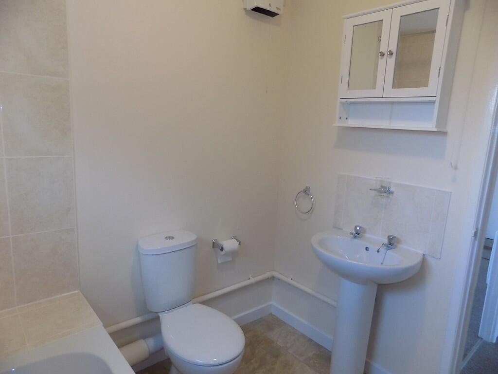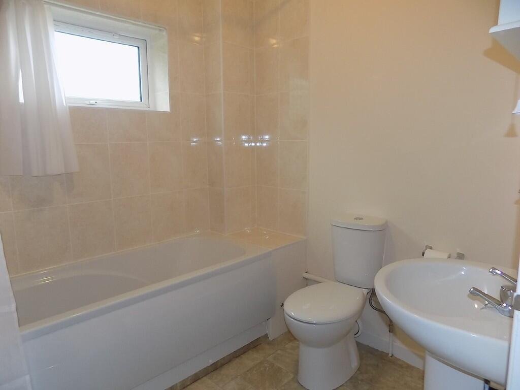 BATHROOM 6′ 8″ x 6′ 8″ (2.03m x 2.03m) Having low level wc, pedestal wash basin and panelled bath with electric shower over, tiled splashbacks, double glazed window to side, wall mounted electric heater.Â