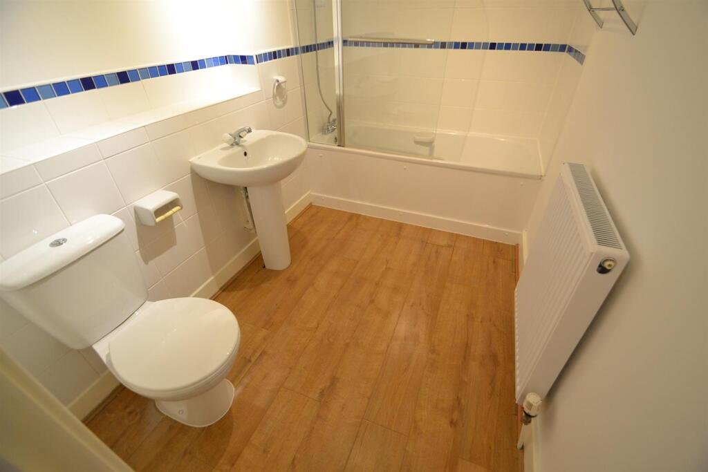 Bathroom – 2.829m x 1.909m (9’3″ x 6’3″ ) – White suite comprising of: low level w/c, pedestal wash basin and bath with shower over. Wood laminate floor, shavers socket, towel ring, radiator and chrome towel holder.