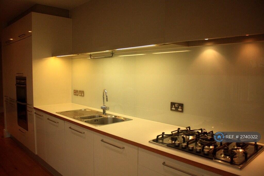 height windows providing plenty of natural light, and sliding doors that lead out to the private walled garden. The kitchen/diner is modern, fully fitted and includes a dishwasher and washing machine, and a great 3 metre long, solid wood table, with a long bench pew on one side and individual seats on the other, which is ideal for ideal for entertaining and/or working.  In the sitting area there’s a large L-shaped sofa