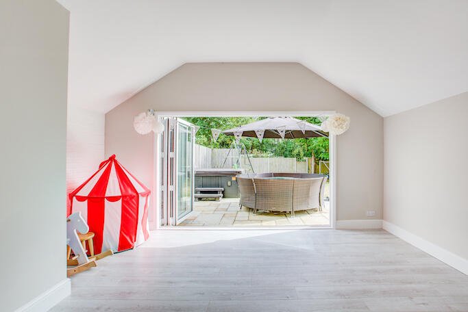 The lounge leads to the open plan kitchen /dining area. This modern kitchen/diner is the perfect entertaining space with island, integrated fridge and modern Aga. Leading from the kitchen/diner is the utility room with space for washing machine and tumble dryer and separate children’s play room or snug. To the rear of the property there is a further room which could be a sixth bedroom as it has a built in shower room. Bi-fold doors to the rear of the property leading onto the garden.