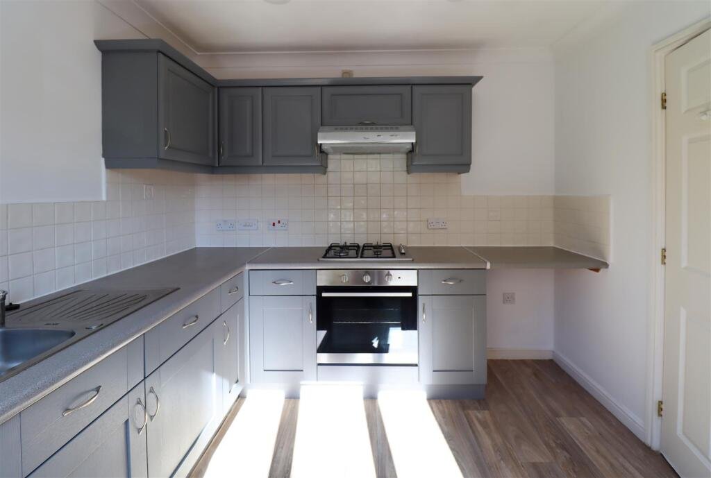 Kitchen – 2.77 x 2.72 (9’1″ x 8’11”) – with built-in oven, hob, extractor fan, space for fridge/freezer and plumbing for washing machine.