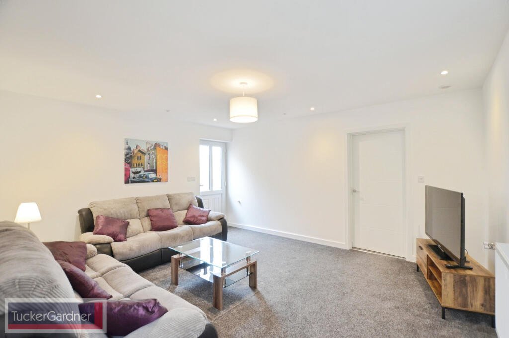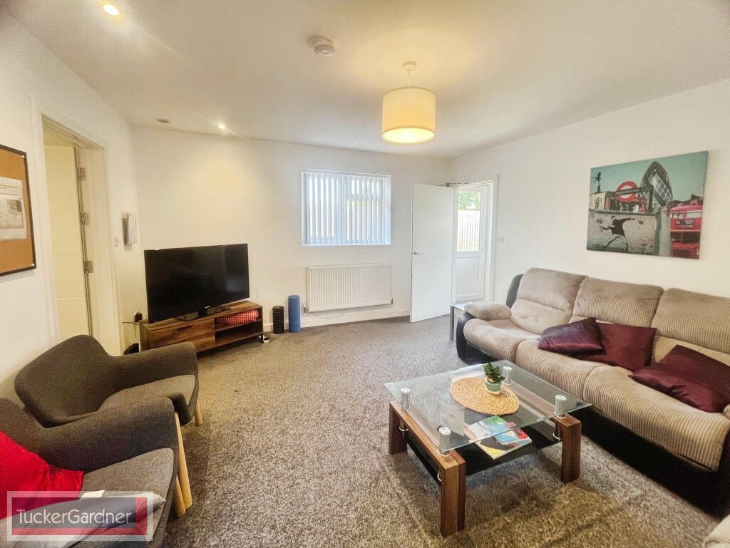 There is a large communal sitting room with furnishings including a two seater sofa and a three seater sofa, corner table with lamp, coffe table, television and side door leading to the side of the property.
