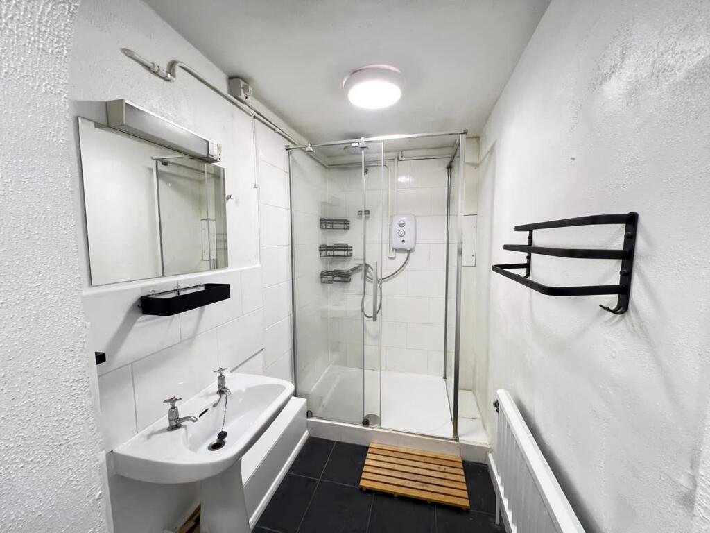 Shower Room Suite comprising shower cubicle with electric shower, low level wc, pedestal sink, part tiled walls, plumbing and space for washing machine and tumble dryer, tiled floor, extractor fan, radiator.