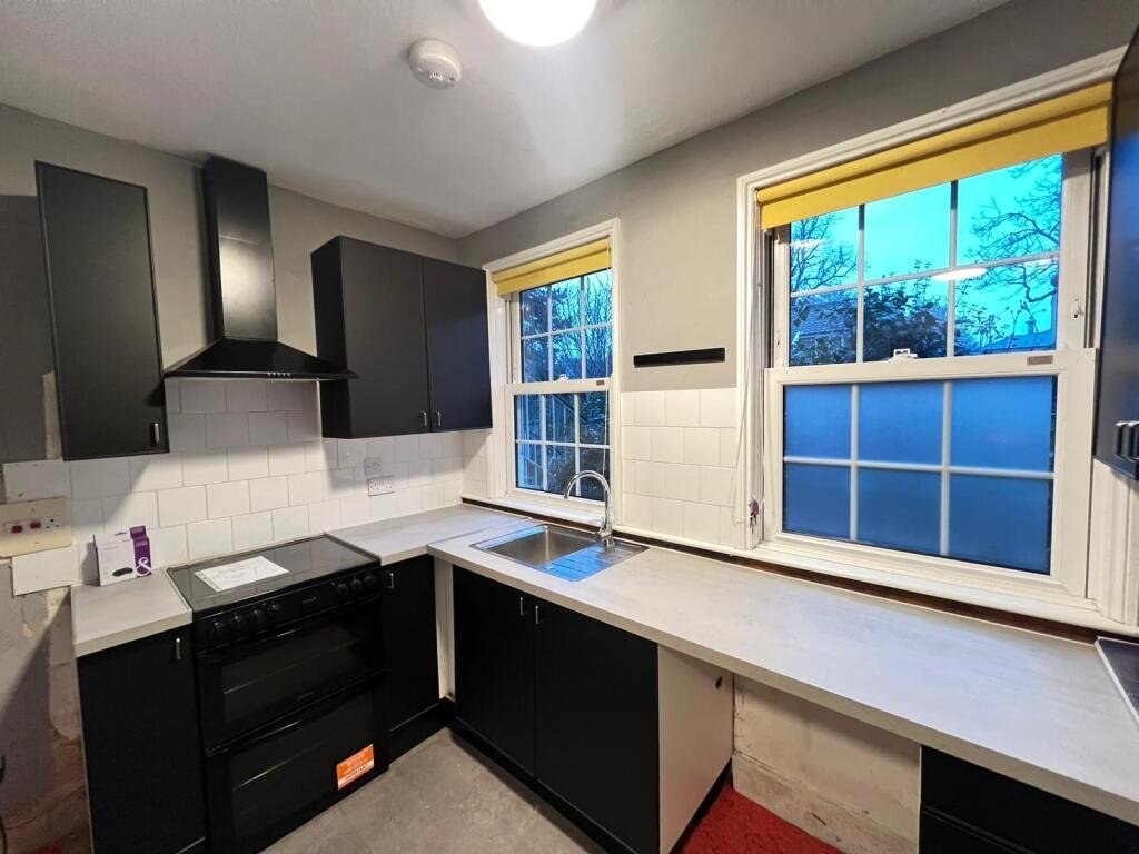 8″ narrowing to 4′ 3″ ( 2.26m x 2.95m narrowing to 1.30m )Double glazed sash windows to front aspect, fitted kitchen comprising a range of wall and base units, work surfaces over, inset stainless steel sink and drainer, tiled splash back, freestanding electric cooker, chimney style cooker hood over, plumbing and space for dishwasher, space for fridge / freezer, breakfast bar, radiator, open to inner hallway