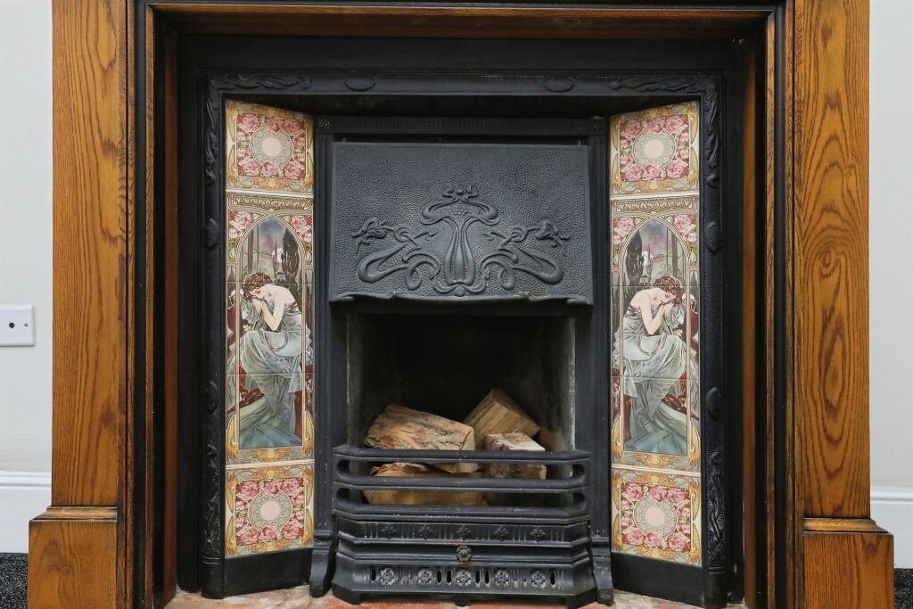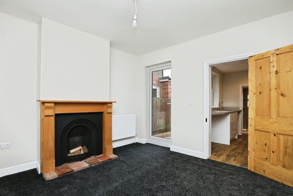 Dining Room 11′ 7″ x 11′ 4″ ( 3.53m x 3.45m )Open fireplace, carpeted flooring, double glazed door to rear, under stairs cupboard, and radiator.