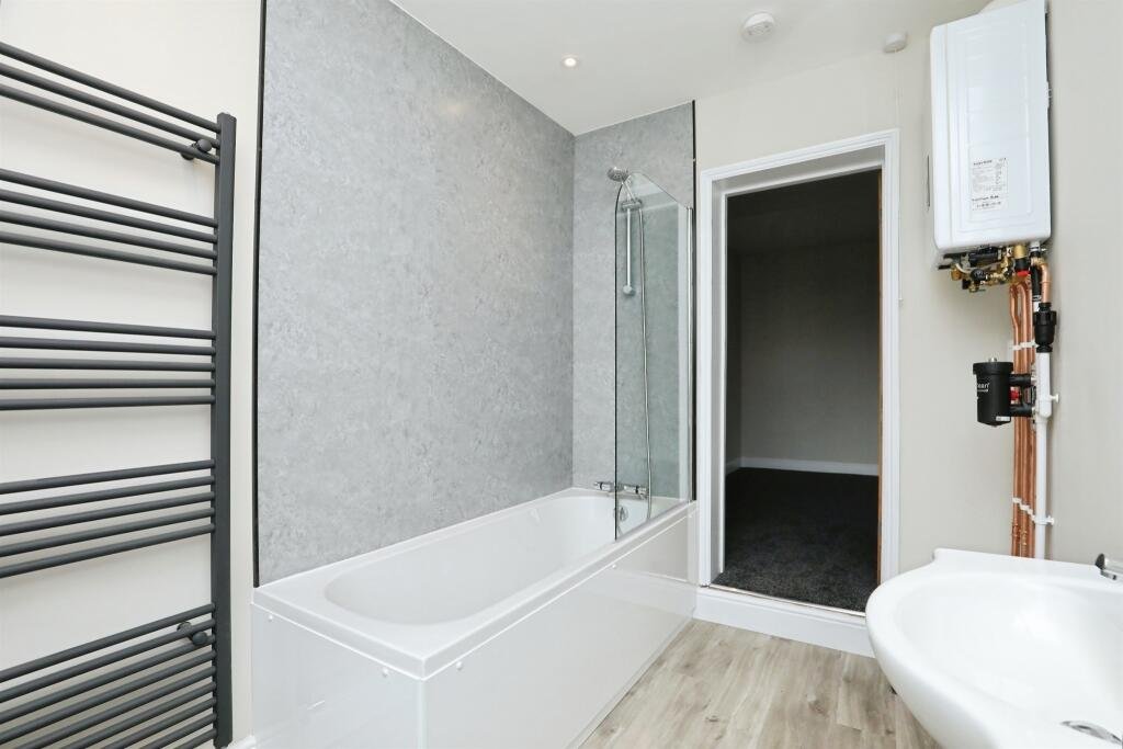 Ensuite Double glazed window to rear aspect, radiator, bath, wc, wash hand basin, boiler, new pipework, boarded tiles over bath, heated towel rail.