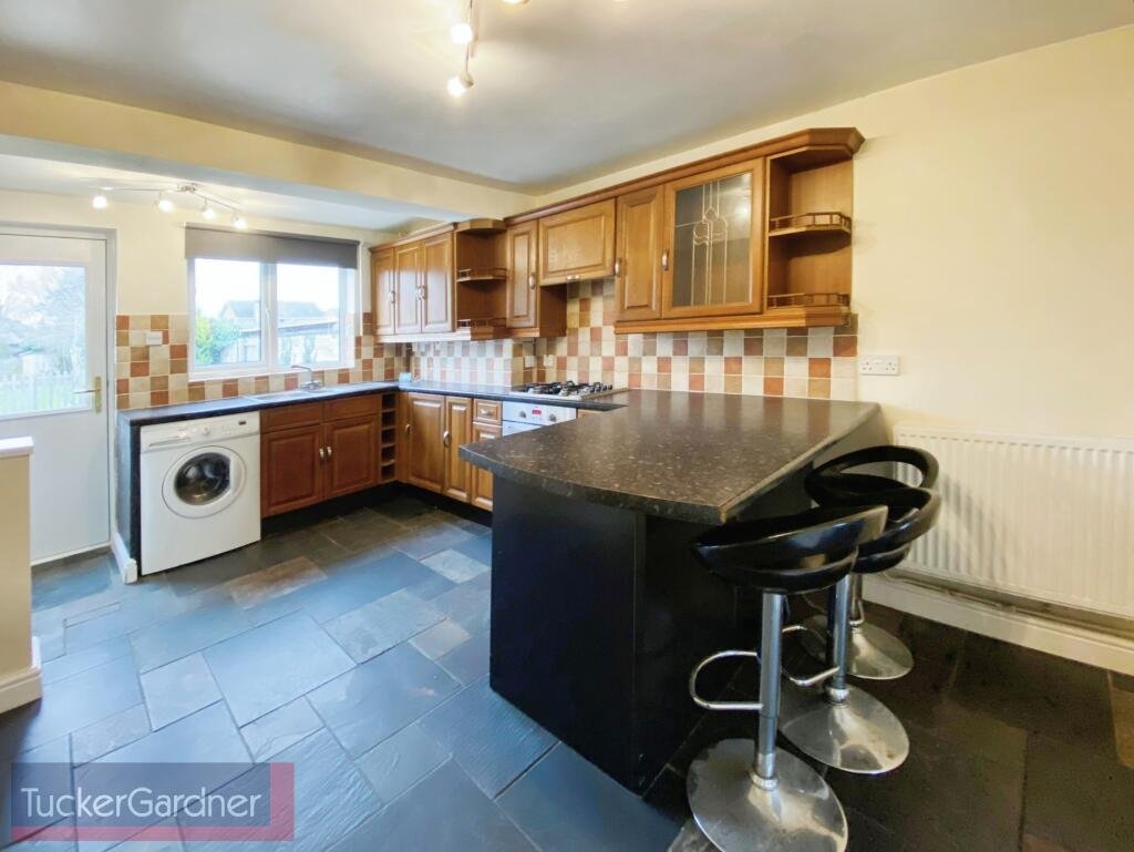 The good size kitchen/diner 15’0″ x 12’9″ includes fitted units, gas hob, electric oven, fridge, freezer and washing machine. Space and plumbing for a dishwasher and tumble dryer. Breakfast bar and three stools.