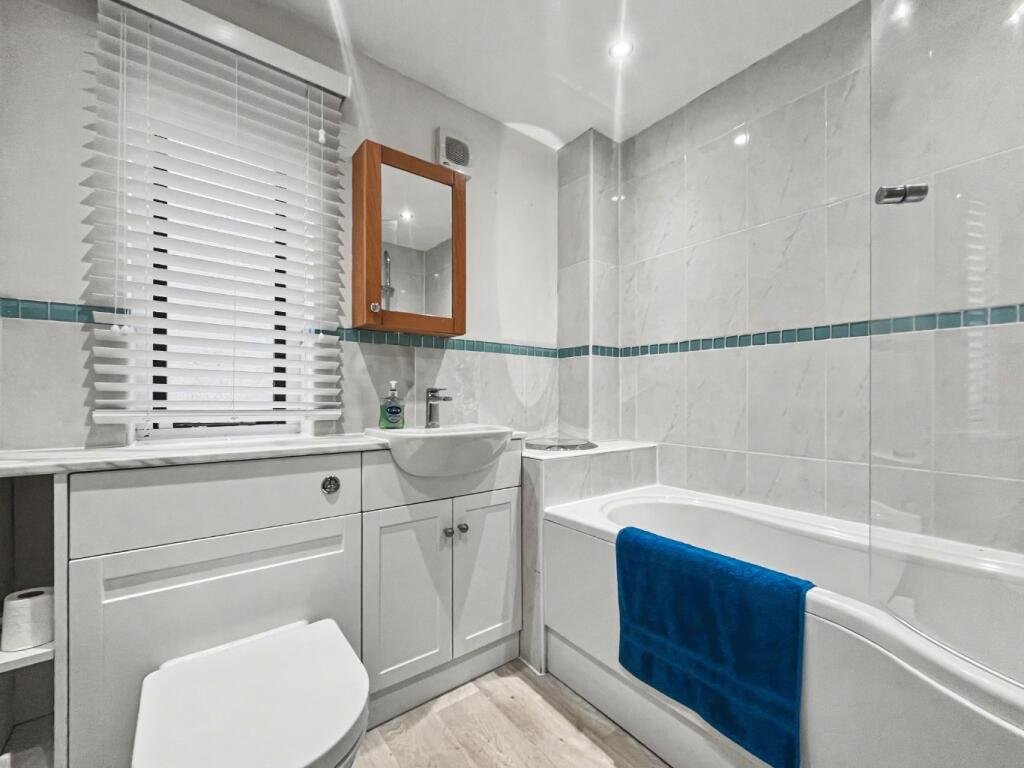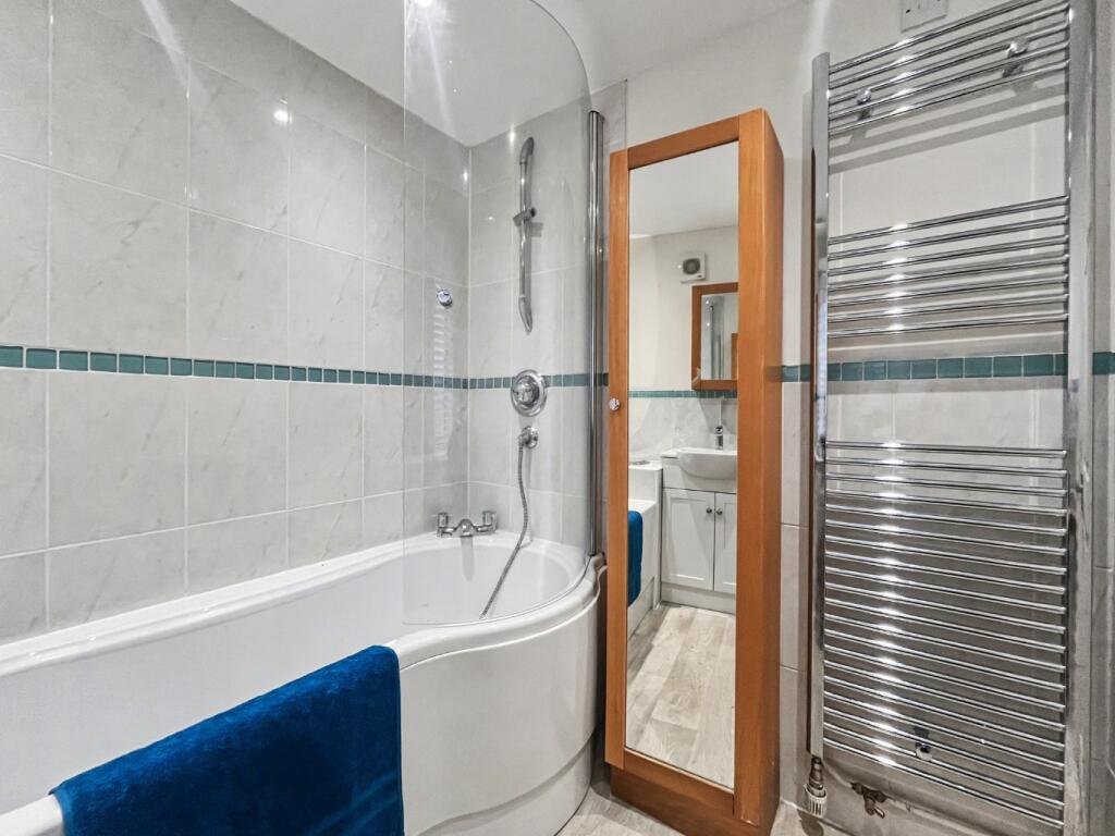 Bathroom: Three piece suite comprising of Shower over `P`shaped bath, vanity sink unit incorporating WC. Window to the front, heated towel radiator.