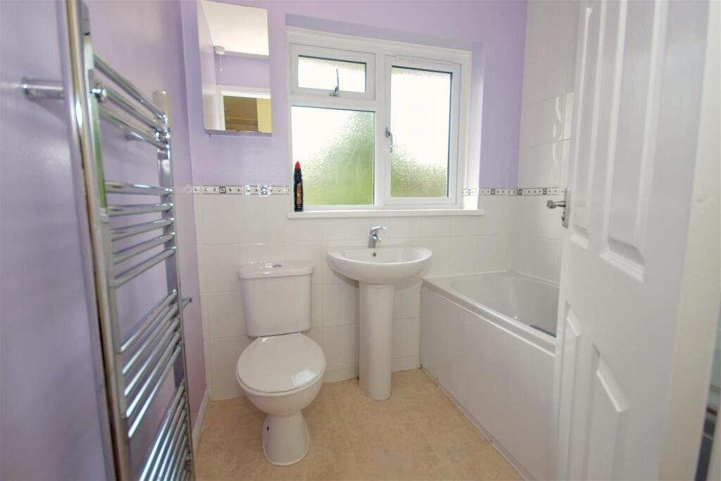 Bathroom – Bath with mixer tap with separate shower attachment, pedestal sink with mixer, WC, vinyl tile effect flooring, obscure UPVC window to rear, chrome heated towel rail, ceiling spotlights, extractor fan.