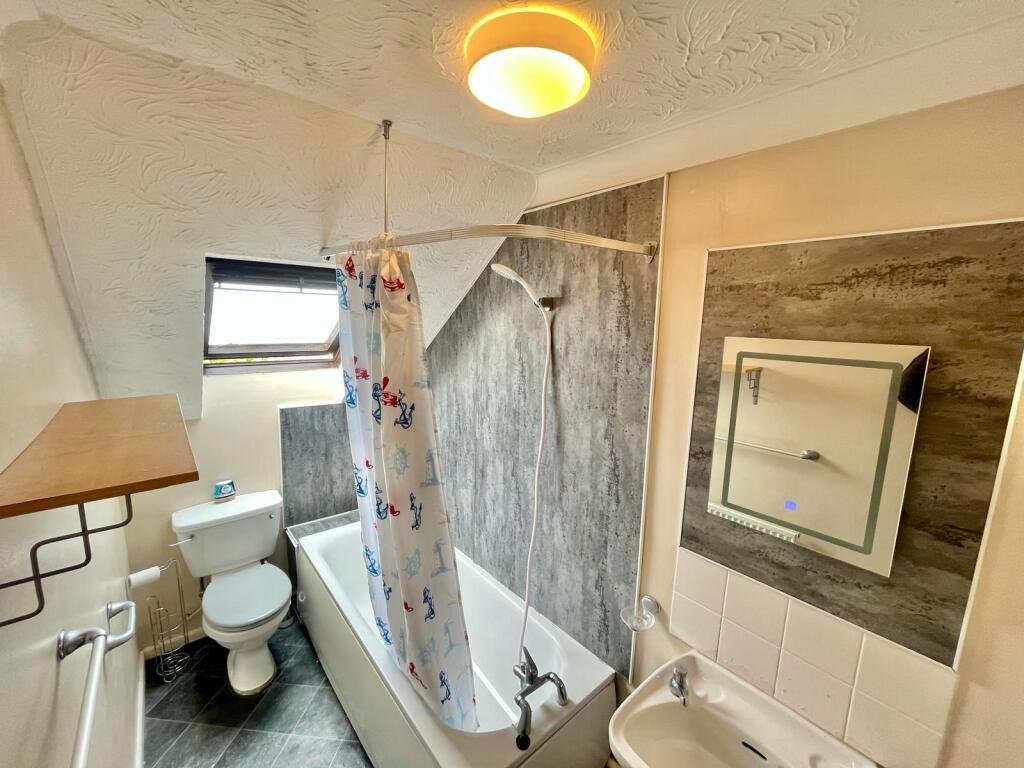 Bathroom Suite comprising panel bath with attached shower, wash hand basin and low level WC. Radiator and tiled splashbacks, Velux skylight window to rear aspect.