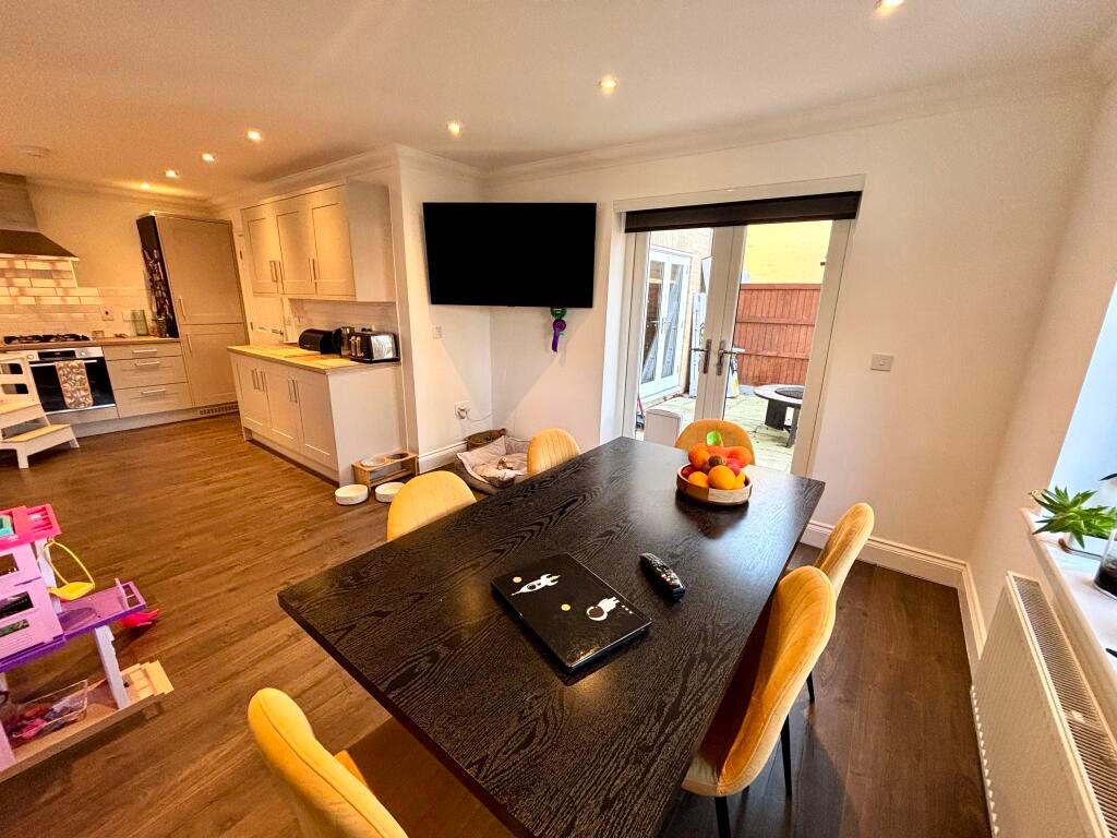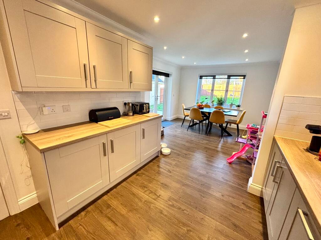 Kitchen/Diner,Spacious, hardwood flooring, range of modern eye and base level units, integrated appliances included: fridge freezer, washing machine and dishwasher, oven with gas hob and extractor fan over. Inset sink with drainer, dining area, windows to side and rear aspect, patio doors to rear.
