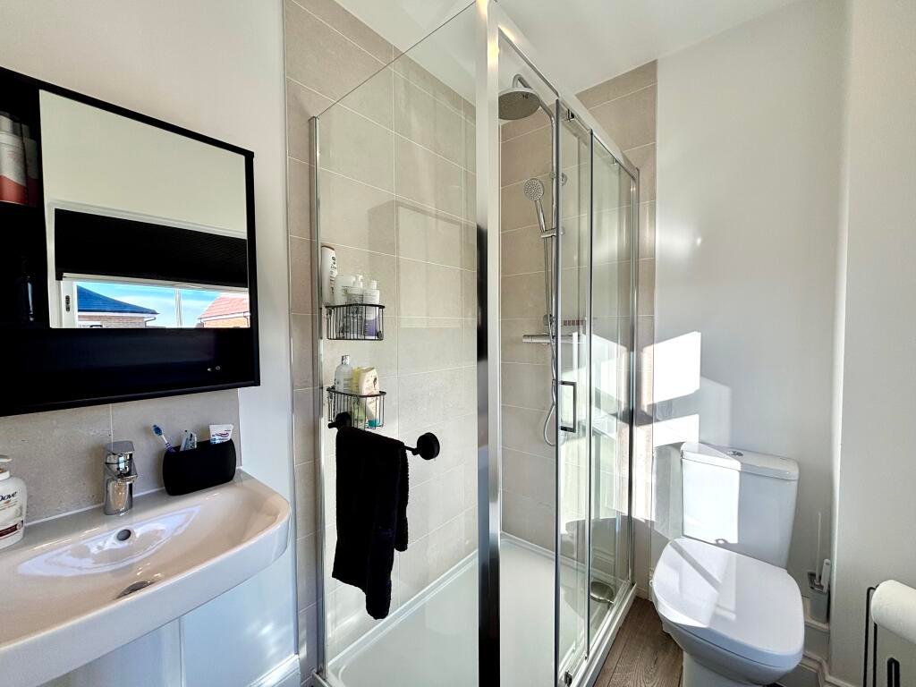 Ensuite,Hardwood flooring, large shower cubicle, low level flush WC, handwash basin, shaver point, extractor fan, window to front aspect.