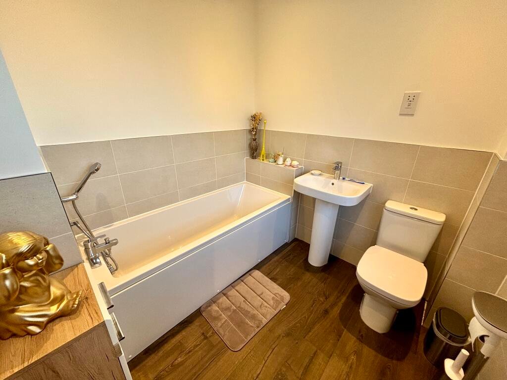 Family Bathroom,Hardwood flooring, bath with shower attachment, handwash basin, shaver point, low level flush WC, extractor fan, obscure window to rear aspect.
