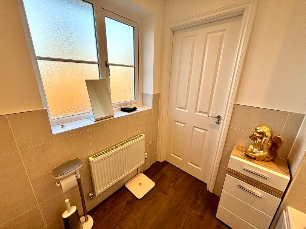 WC,Hardwood flooring, low level flush WC, handwash basin, extractor fan, obscure window to rear aspect.