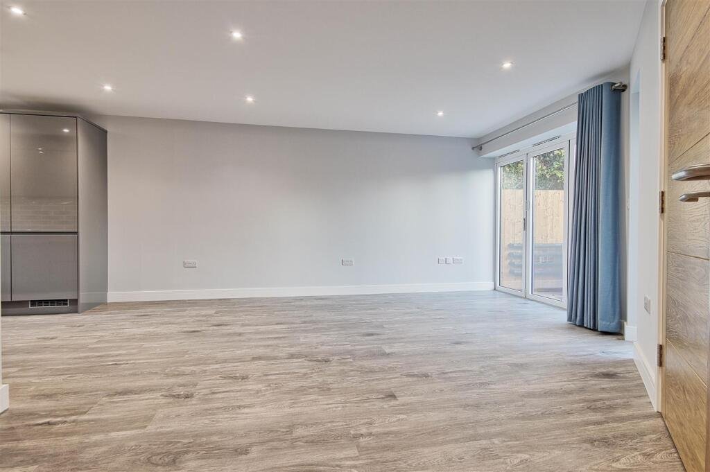 Moving to the rear, the heart of the home is the expansive open-plan kitchen, living and dining room. This impressive space spans the length of the property and is finished with the same high-quality wood-effect flooring for seamless continuity. The living/dining area is flooded with natural light thanks to the full-width bi-folding doors opening onto the rear garden—creating a bright, inviting space ideal for entertaining or simply relaxing.