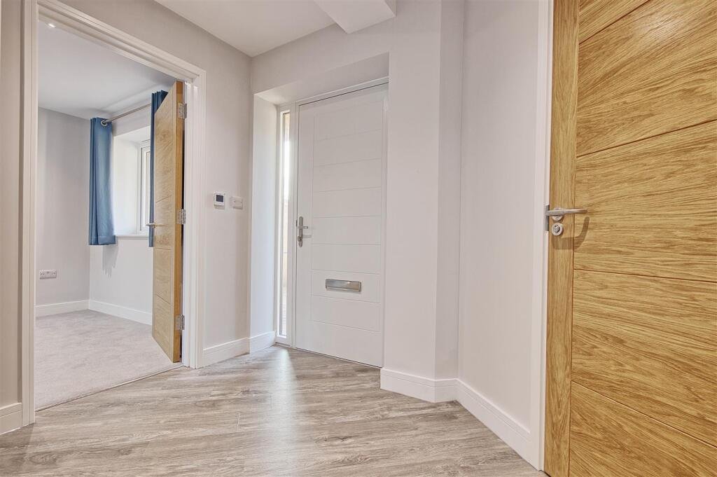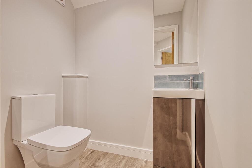 As soon as you enter the property, the attention to detail and immaculate condition are immediately apparent. The hallway is finished with stylish wood-effect flooring in soft grey tones, creating a warm yet modern first impression. To your left is the convenient ground-floor W.C., fitted with a contemporary vanity unit in a deep grey gloss with a matching mirror above, soft blue wall tiles and chrome fittings.