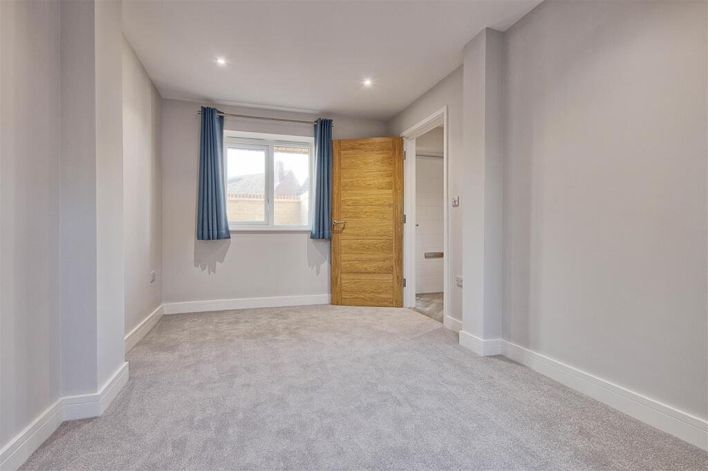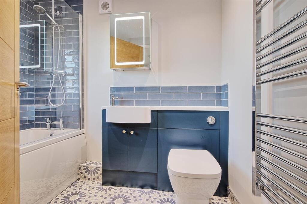 On the first floor is Bedroom 1, a generous double bedroom finished with soft new carpeting and grey walls, offering a tranquil retreat. The main bathroom sits adjacent to the landing and is finished to an exceptional standard with deep navy cabinetry, patterned floor tiles, a modern white suite and a bath with dual purpose shower. Chrome fittings and a heated towel rail and wall mounted heated mirror and light add further comfort and practicality.