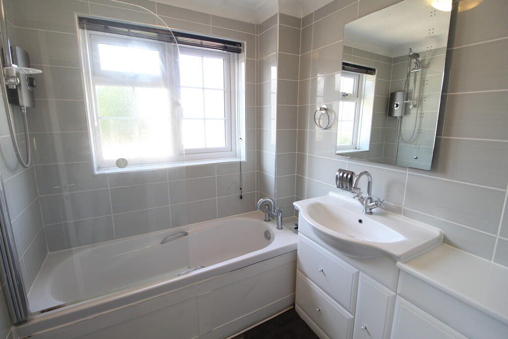 BATHROOM 6′ 01″ x 6′ 08″ (1.85m x 2.03m) Modern suite, shower over bath, WC and hand basin. Window to