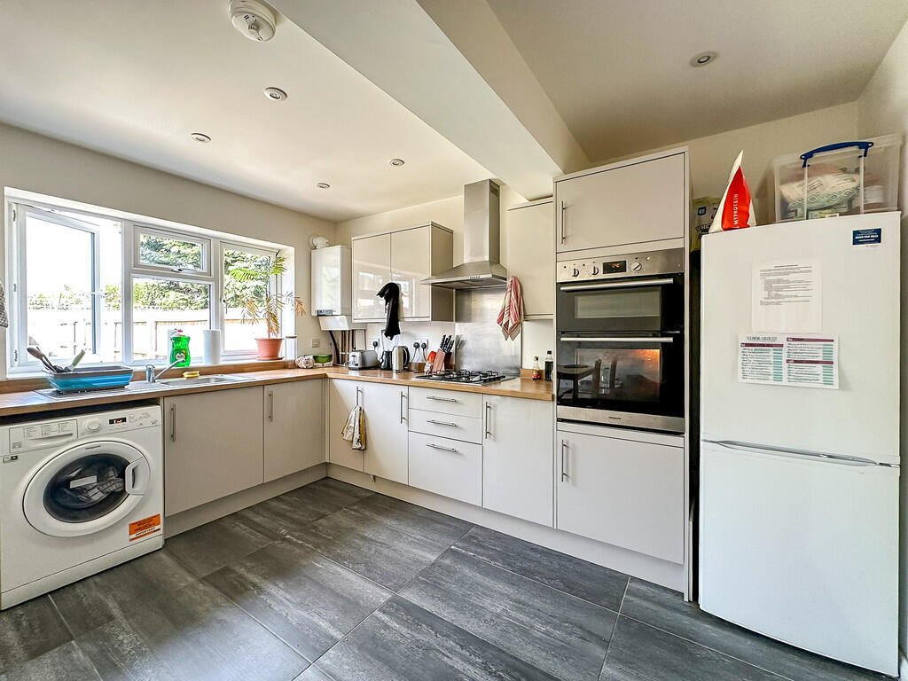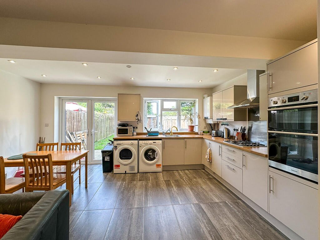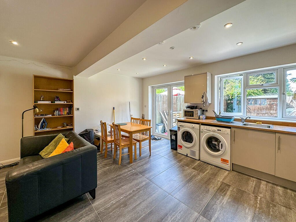 with tiled flooring and high gloss wall and floor cabinets. There is an electric oven, hob and extractor fan with a chrome finish. Included in the communal area there is a dishwasher, fridge/freezer, washing machine and tumble dryer. Residents also have a dining area with a table and chairs and a living space with two sofas and a coffee table. Patio doors lead out to the rear garden and patio.