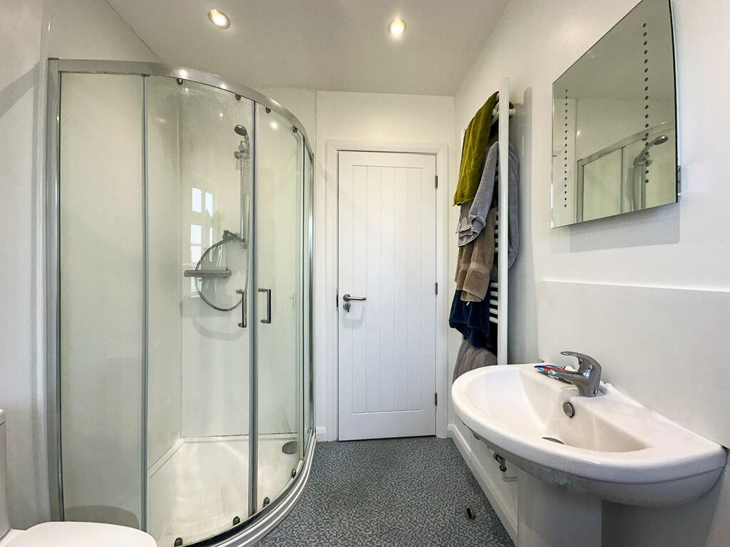 COMMUNAL SHOWER ROOMS Located on the 1st & 2nd floors there are two communal shower room is shared by five tenants. Spacious and modern with a large shower cubical, chrome wall mounted heated towel rail, wc, basin and patterned laminate flooring. With extractor fans and windows out.