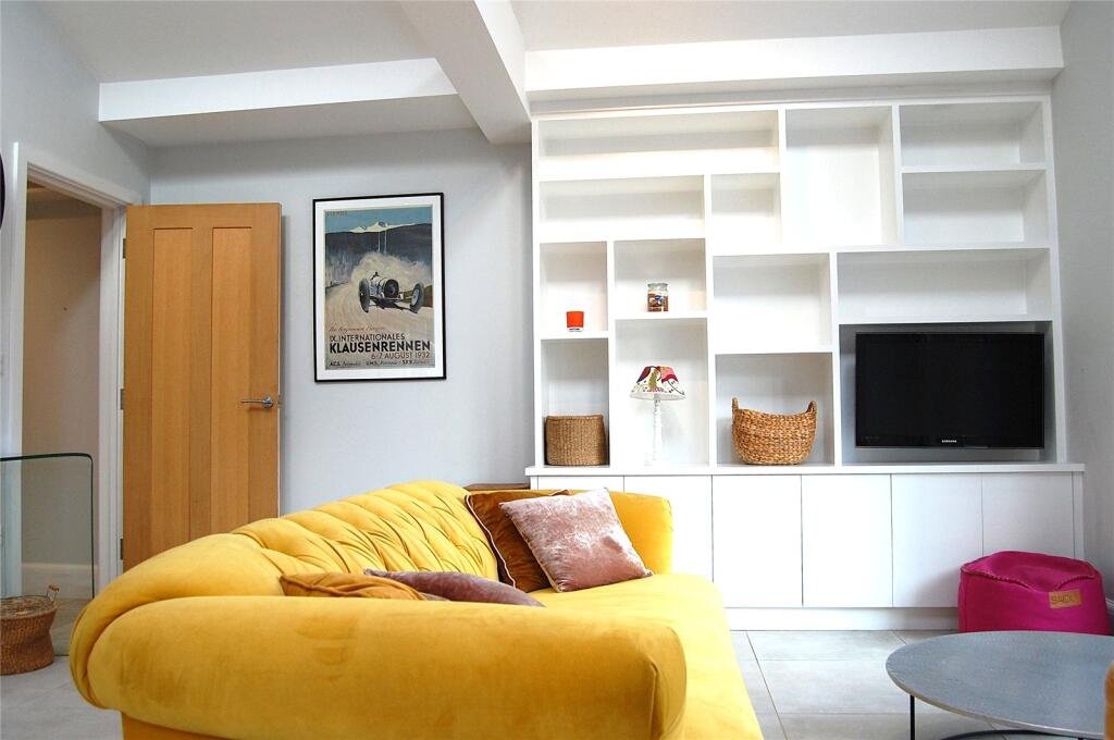 OPEN PLAN LIVING AREA: 15’10 x 14′ light room with vaulted ceiling and velux windows, built-in media unit/shelving and cabinets, tiled
