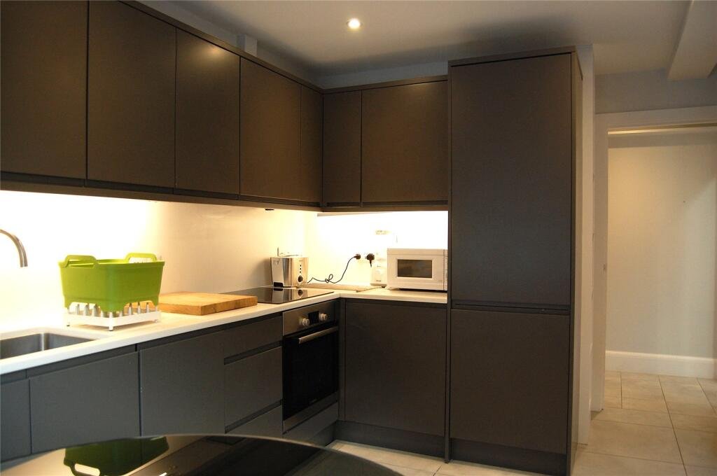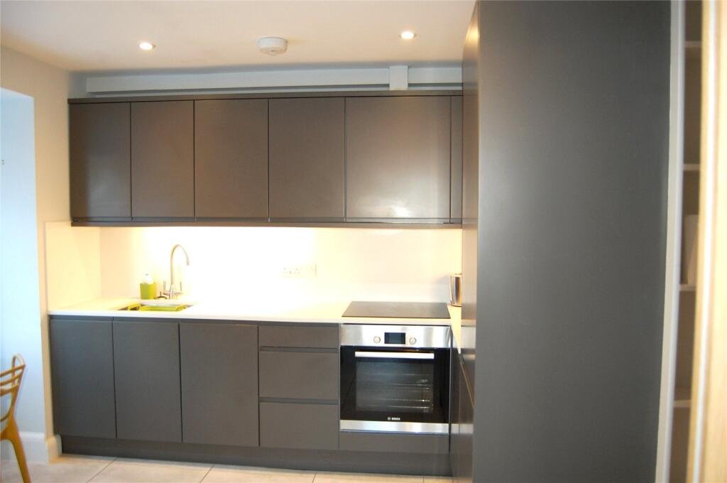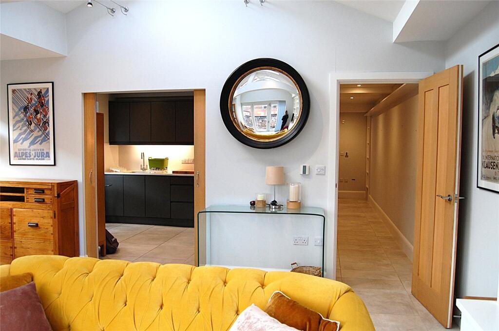A fabulous two bedroom, two bathroom modern apartment in the centre of Bury St Edmunds with a private parking space. The first floor flat has a super light open plan living area with engineered wooden floors, vaulted ceiling and bi-fold doors onto a balcony. Pocket doors lead onto a fully integrated Kitchen with space for a dining table.