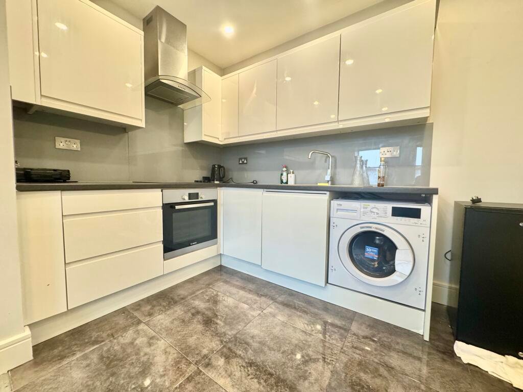 Kitchen Tiled flooring, range of modern wall and base units, built in cooker and electric hob, integrated washer/dryer.