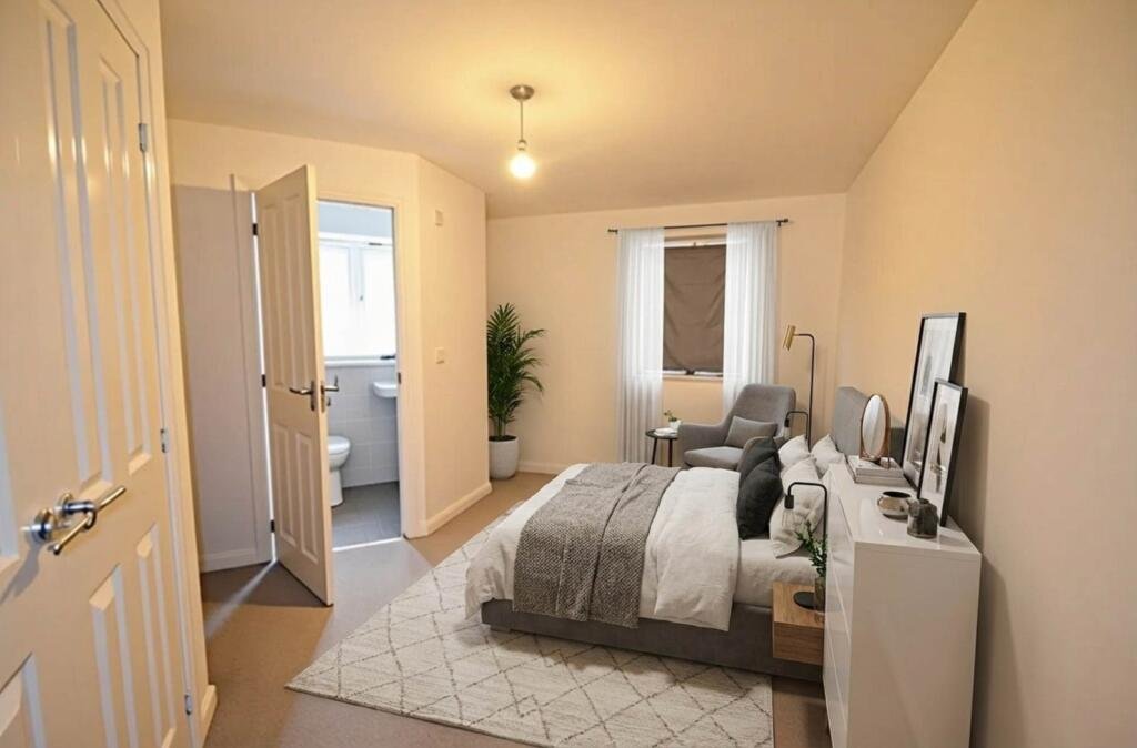 The master bedroom is a spacious and comfortable room that benefits from a large, modern en-suite bathroom. There is plenty of room for a king-size bed and bedside tables and the room also boasts large windows, making it a bright and airy space.