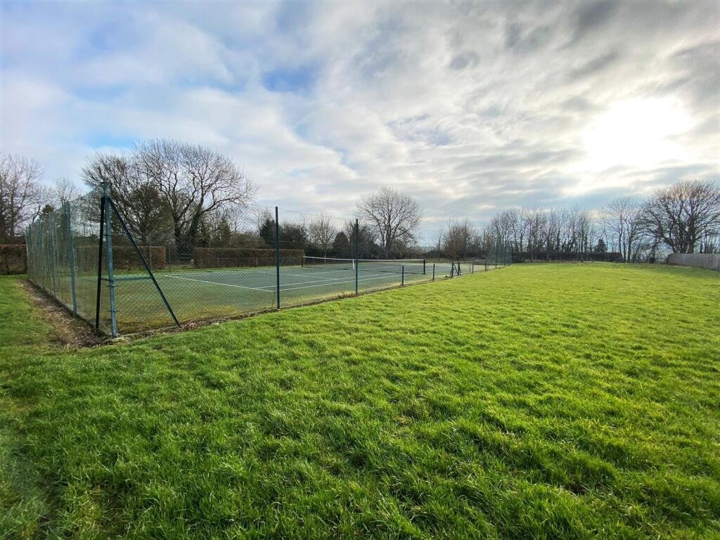 The garden is mostly laid to lawn with a patio area, ideal for outdoor furniture. A gravelled pathway leads to additional outdoor space, including access to a tennis court.