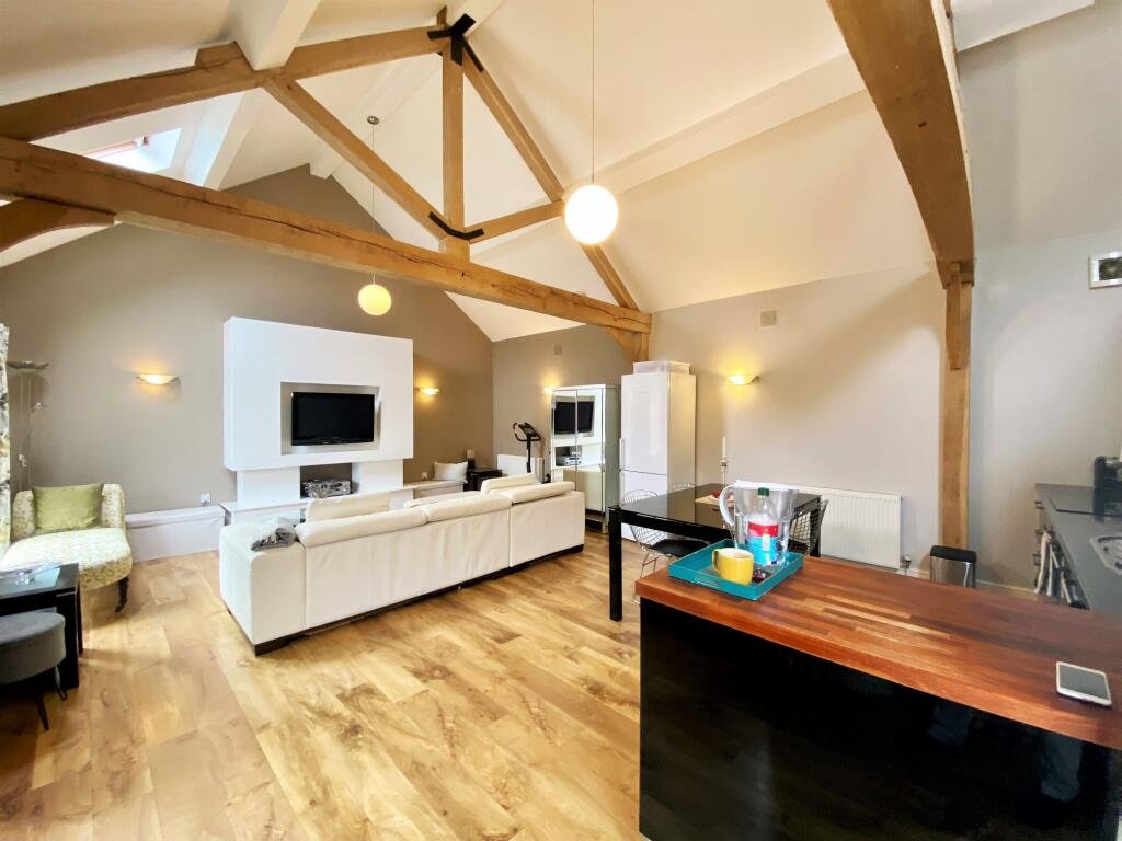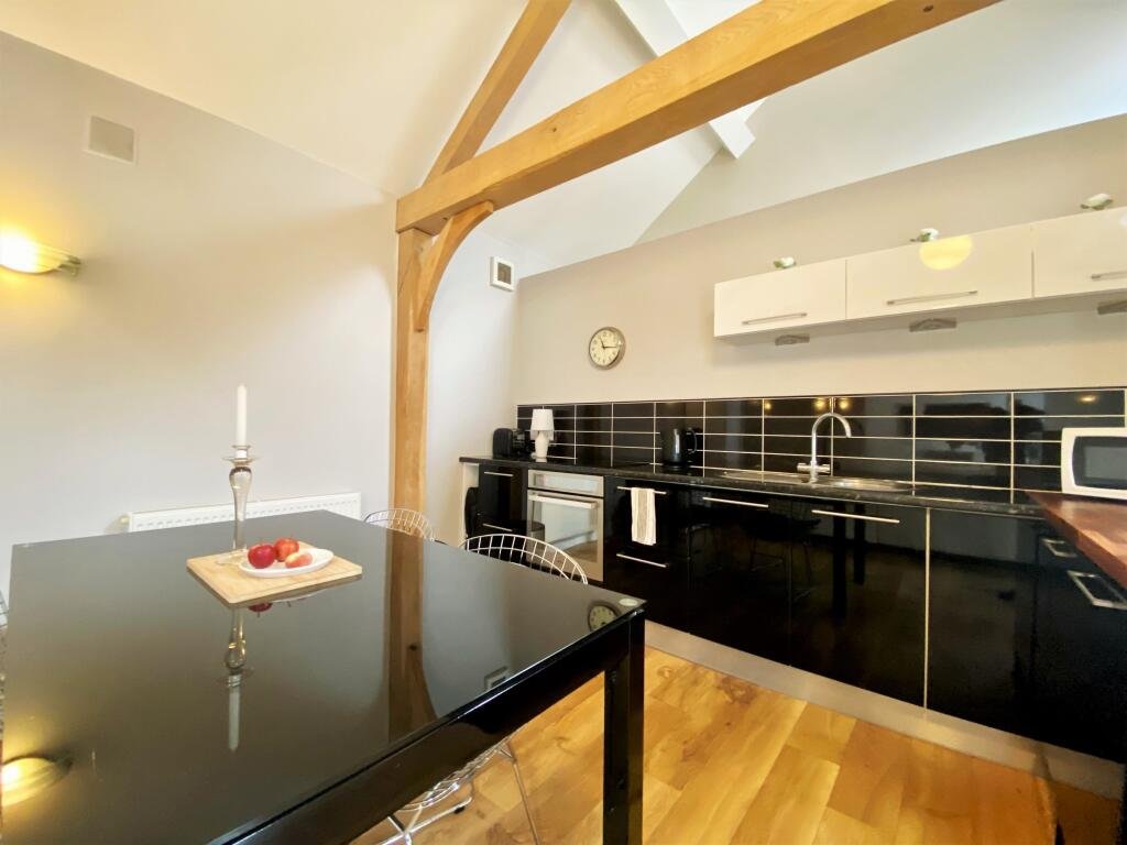 Upon entering the cottage, you are welcomed into an open-plan kitchen, living and dining area. The exposed beams, vaulted ceiling and