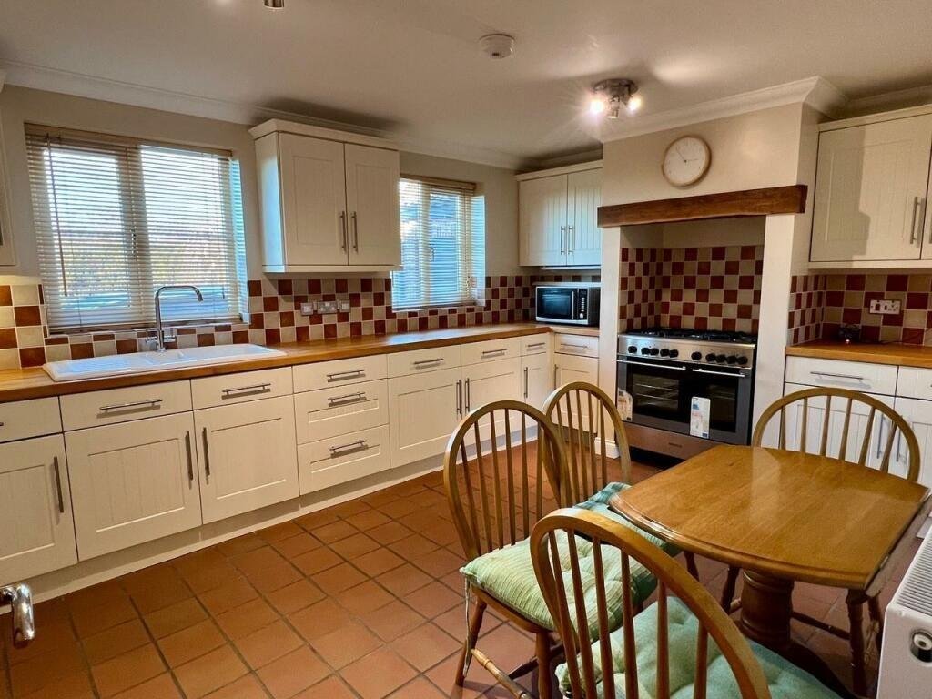 Kitchen/Breakfast Room: 3.68m x 3.17m (12′ x 10’4″) with matching floor and wall units, white ceramic sink with mixer taps, range oven with calor gas stove set into fireplace, integrated fridge, integrated freezer, tiled flooring and door to: