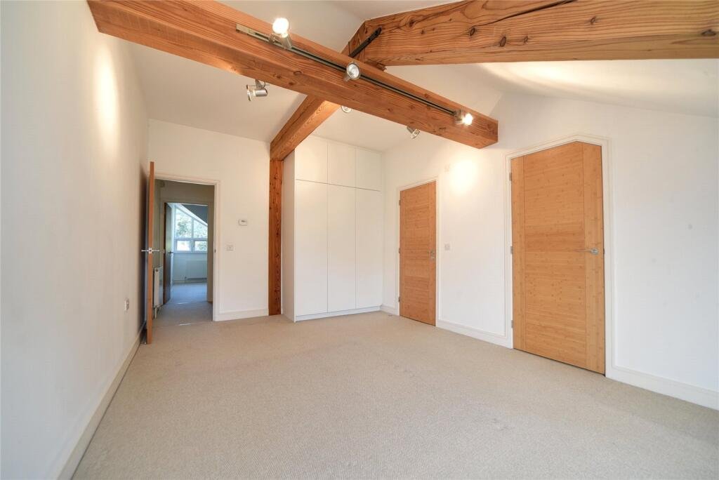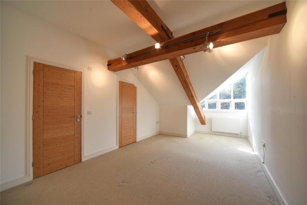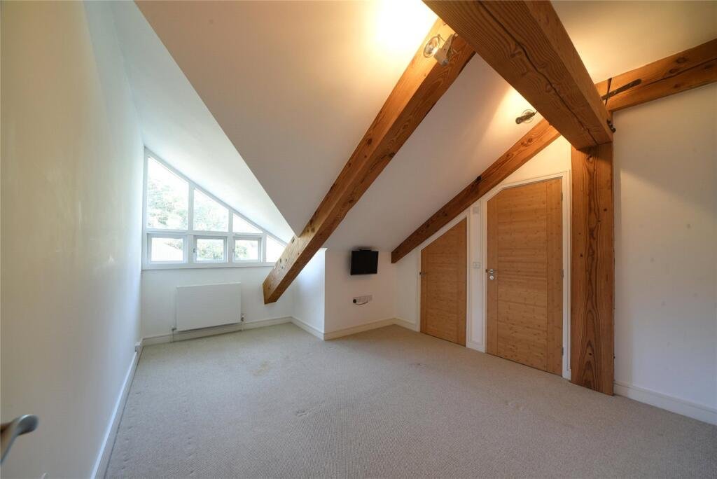 BEDROOM TWO:Tv point with TV on wall mount, storage cupboard, window to side and exposed wooden beams.