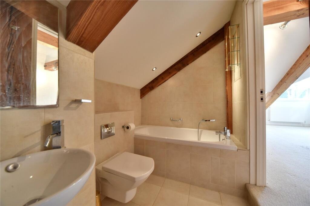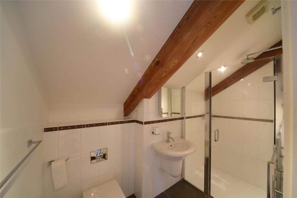 EN-SUITE:Suite comprising of low level WC, handbasin, shower cubicle, mirror and exposed wooden beams.