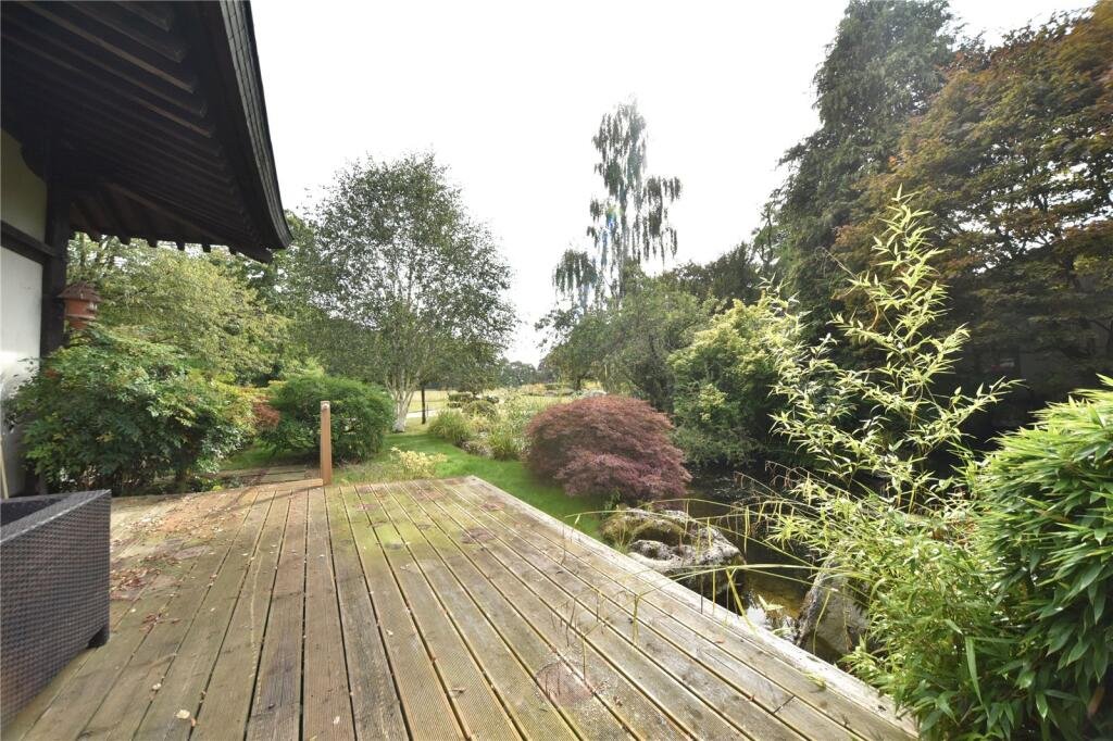 OUTSIDE:Beautiful decking area overlooking ornamental pond with waterfall and off street parking for two cars.