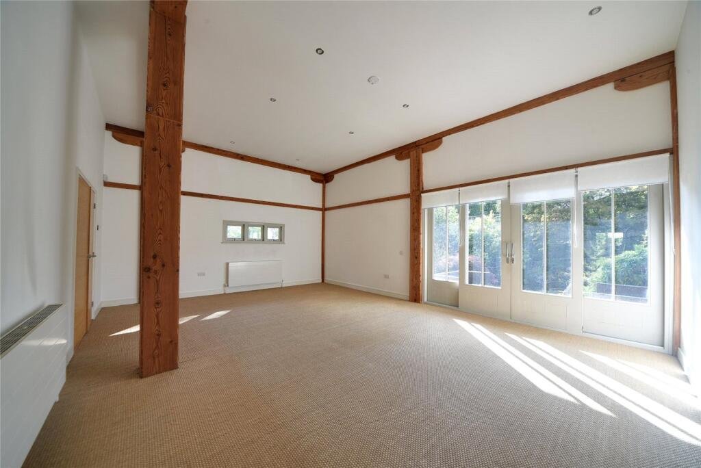 LOUNGE:Double doors opening to patio, exposed wooden beams, TV + Tel points.